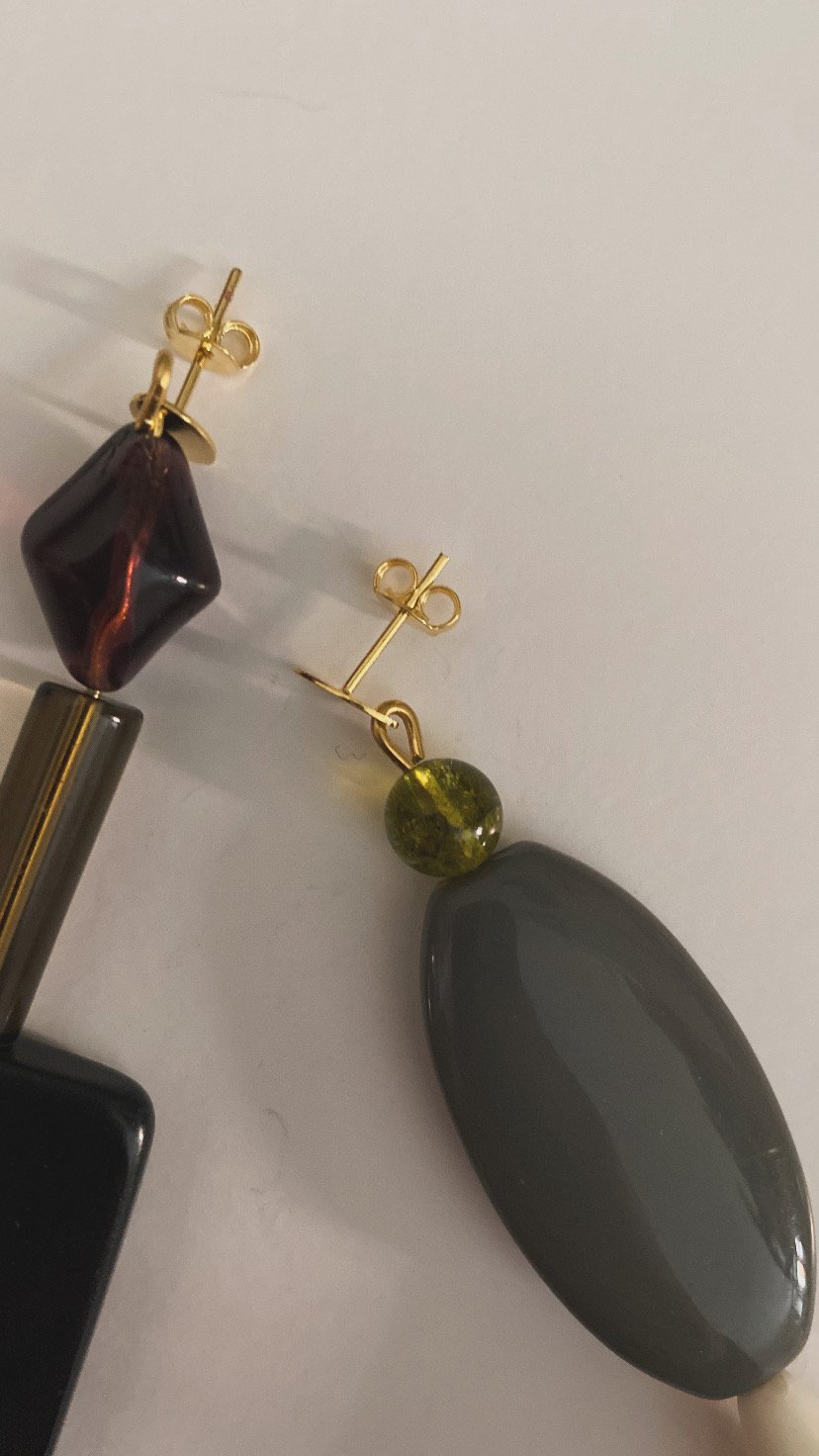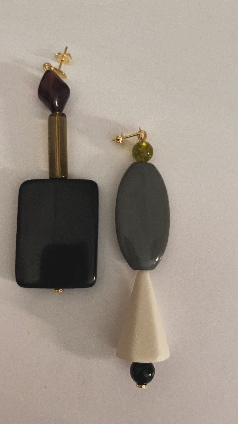 Par de pendientes compuesto por piezas de resina vintage, vidrio, Onix y bases de Goldfilled.