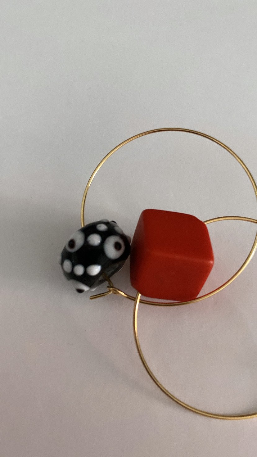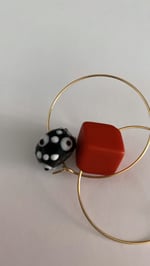 Pendiente compuesto por aro fino de latón chapado en oro de un diámetro de 35mm y por abalorios de resina y abalorio de cristal de murano negro moteado.