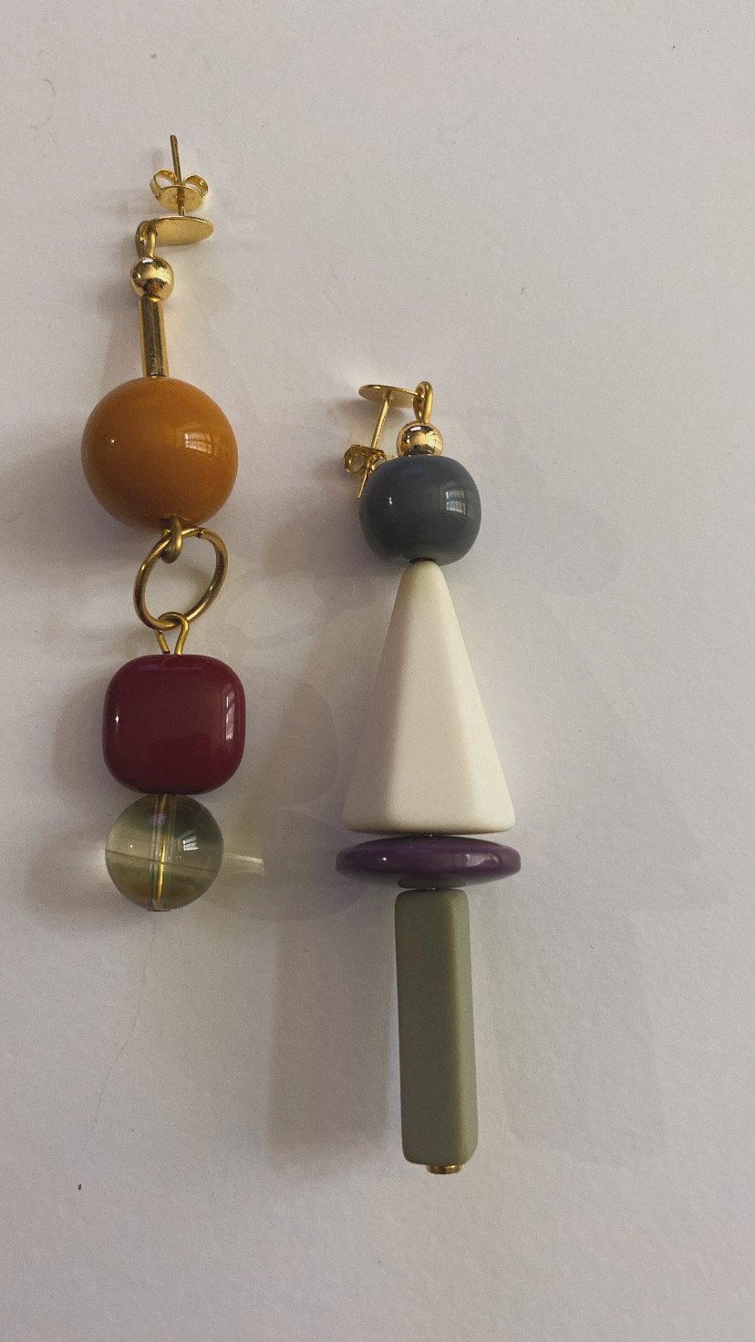 Par de pendientes movil compuesto por piezas de resina vintage, cristal, latón y bases de Goldfilled.